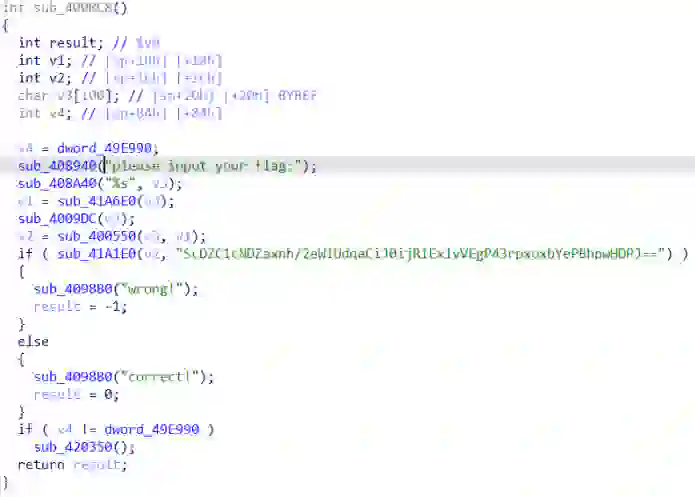 分析一下工作流程,用户输入flag到v3,之后会到sub_41A6E0这个函数进行处理,我们到这个函数看看