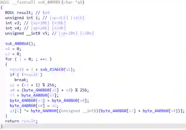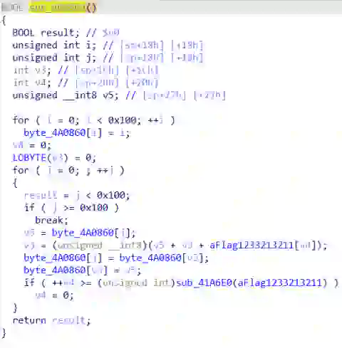 分析了一下,这个函数似乎是RC4加密,比如其中的256(0x100)大循环和% 256这种操作,以及作为秘钥的flag{123321321123badbeef012},我们再看看下个函数sub_4550