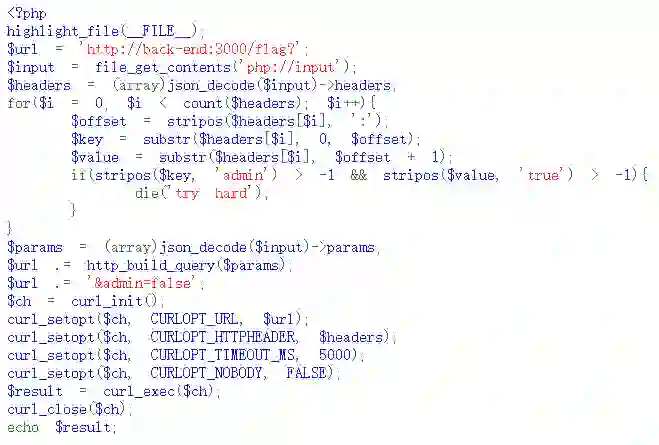 这段 PHP 代码会转换输入的 headers头 为数组,然后循环遍历每个头部,检查是否有以 admin 为关键字且值为 true 的头部,然后从输入中提取 params 参数,将其转化成字符串,追加到 url 后面,同时在后面追加 &admin=false