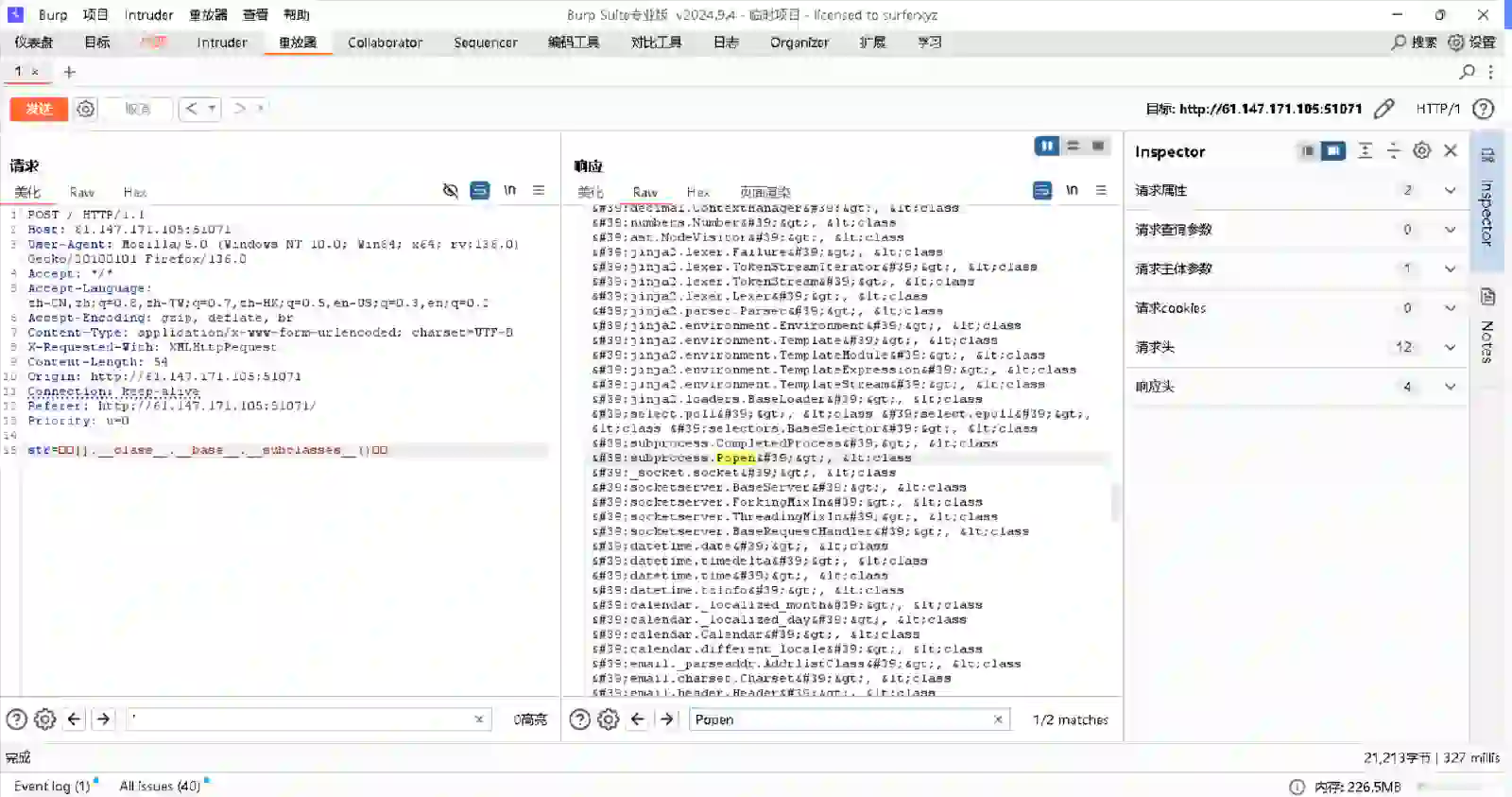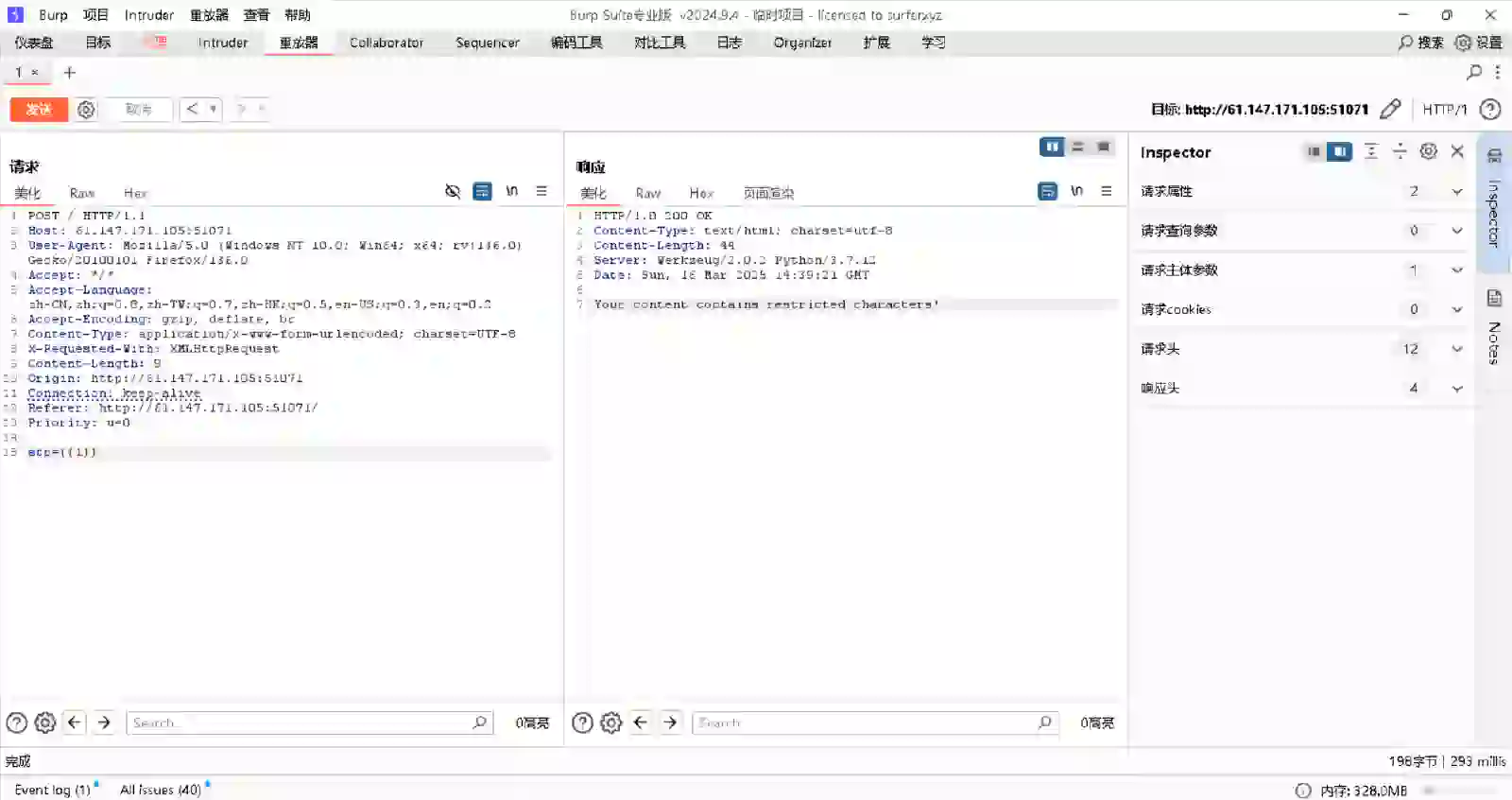 我们再发包试试(Burpsuite里面的特殊字符显示成方框了)