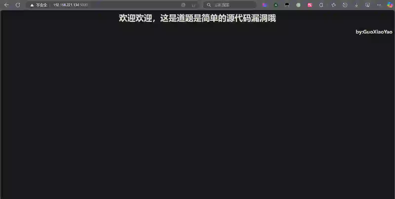 return f"<h1 align=""center"">欢迎欢迎,这是道题是简单的源代码漏洞哦<h1>\n<h3 align=""right"">by:GuoXiaoYao</h3>"