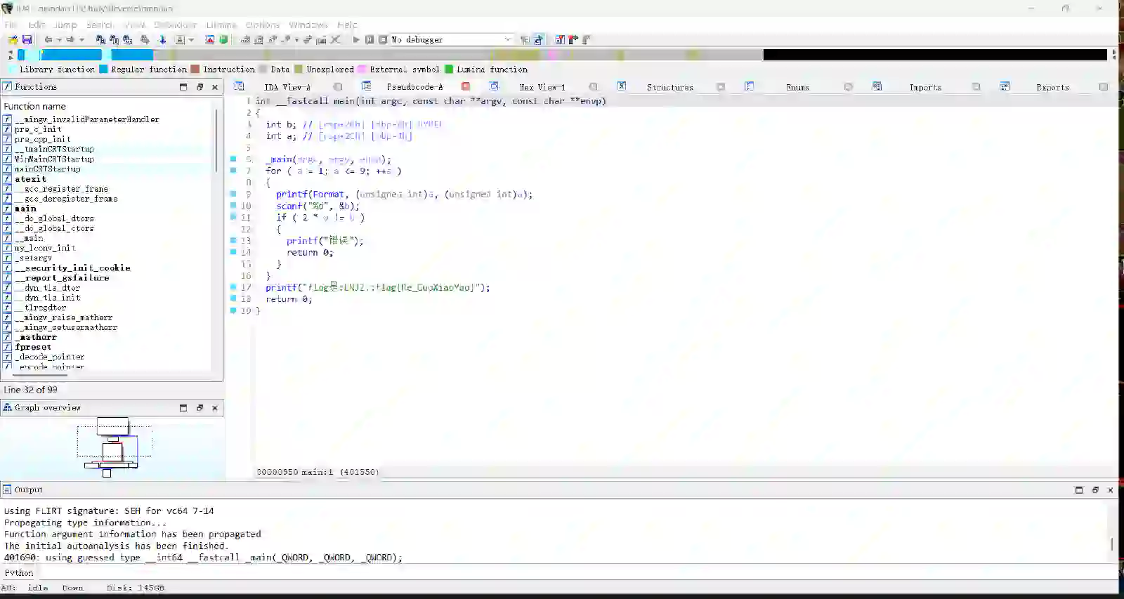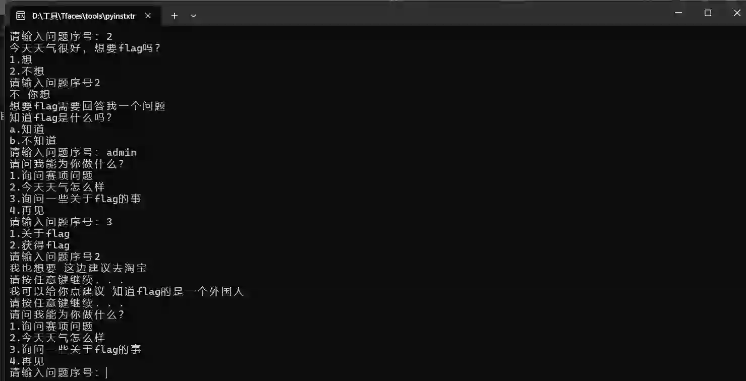 PS:后来问了出题的朋友,这道题只要按次序输入2 2 flag y 10就能得到flag了 :D