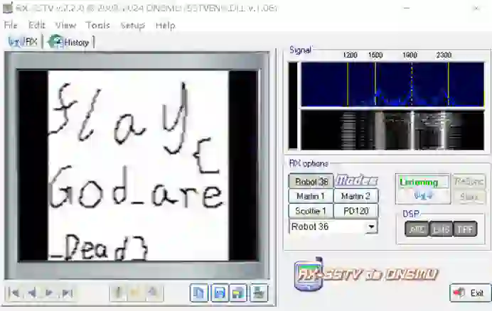 我们听到了奇怪的音频,这里就考验对杂项的了解了,这其实是SSTV扫描音频,我们可以用手机软件Robot36或者电脑软件RX-SSTV转成图片